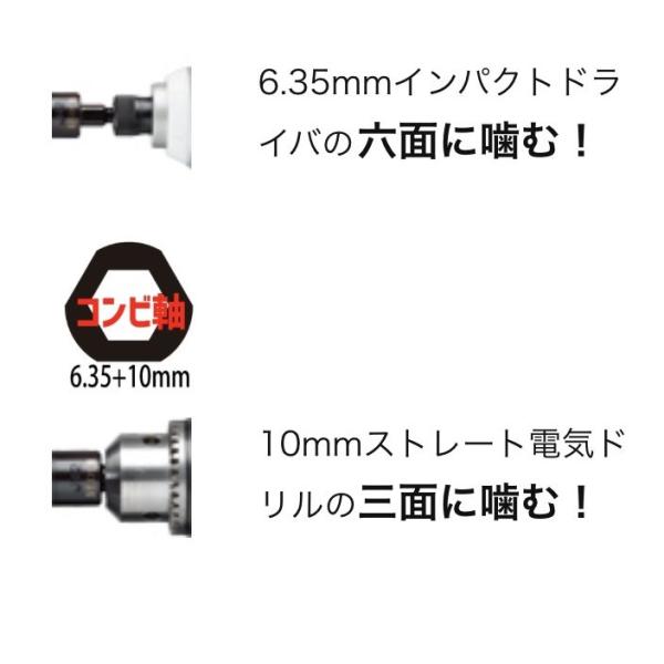 高耐久コンビ軸搭載により六角軸(対辺6.35mm)とチャック式(10mm)の両方に使用可能で、使用の際の安全性も提供致します。