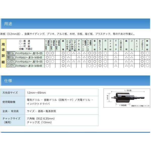 鉄板(3.2mm迄)、金属サイディング、ブリキ、アルミ板、木材、合板、塩ビ板、プラスチック、等の穴あけ作業に。