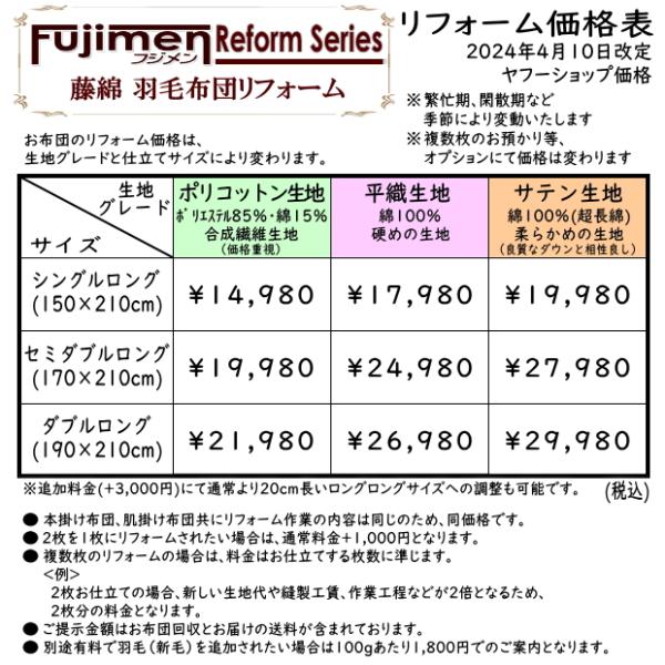 羽毛布団 打ち直しリフォーム シングル サイズ変更可能 ポリコットン生地/羽毛洗浄再生込み料金・羽毛洗浄クリーニング