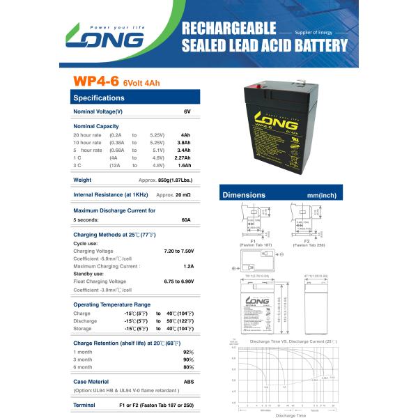 ・定格容量:6V4Ah(容量は20時間率で計算されています)