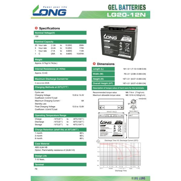 数量限定特価 LONG 【耐久性1.5倍・期待寿命7〜10年】12V20Ah 密閉型ゲルバッテリー(LG20-12N)高サイクル・長寿命 あらゆる電源に最適 蓄電容量240Wh