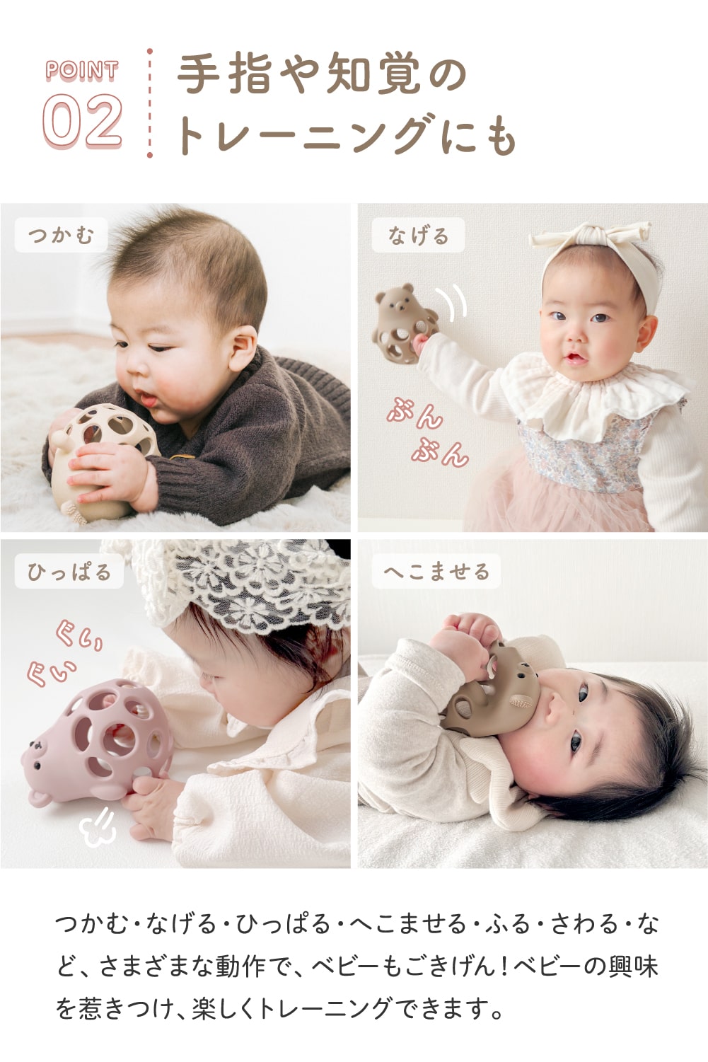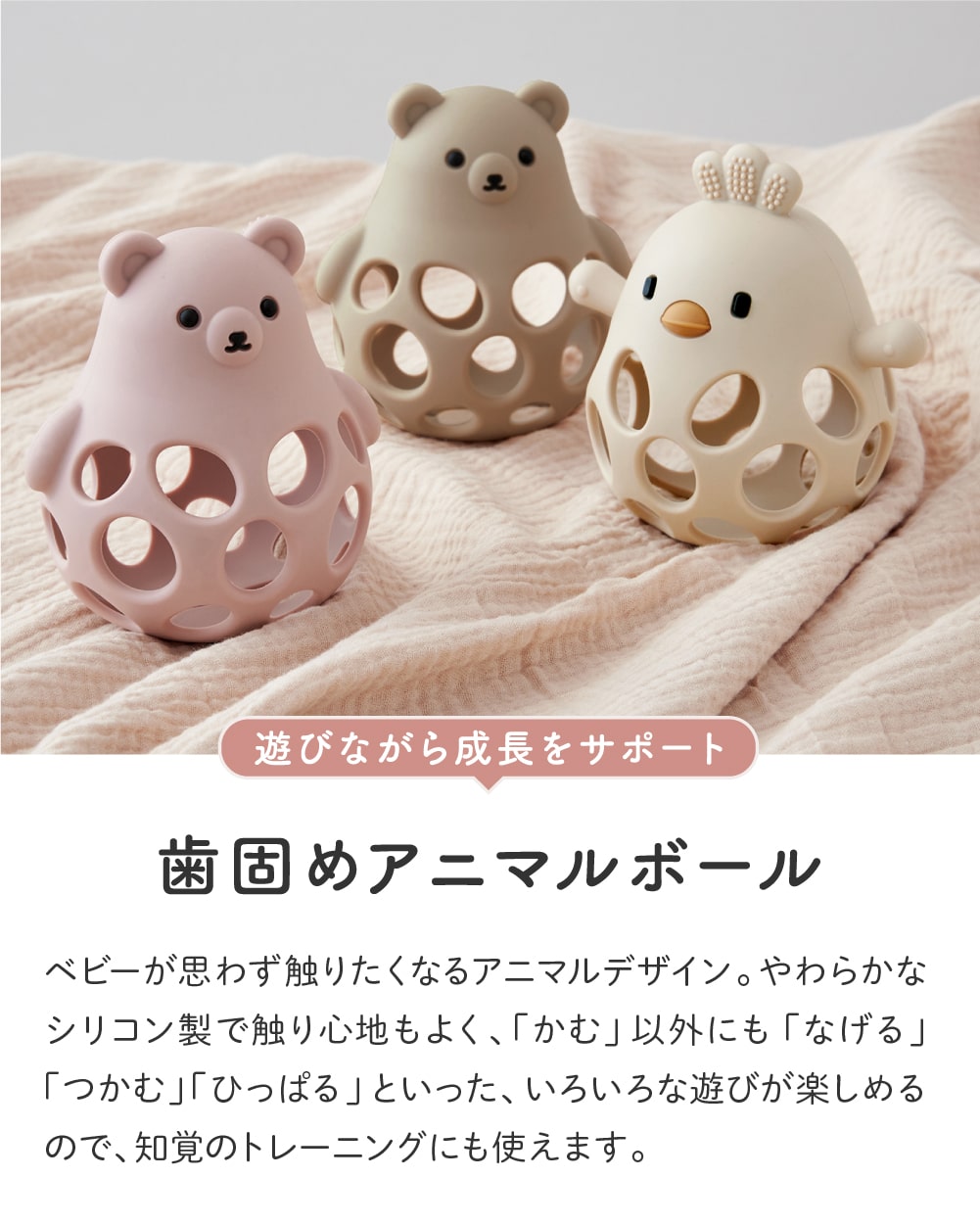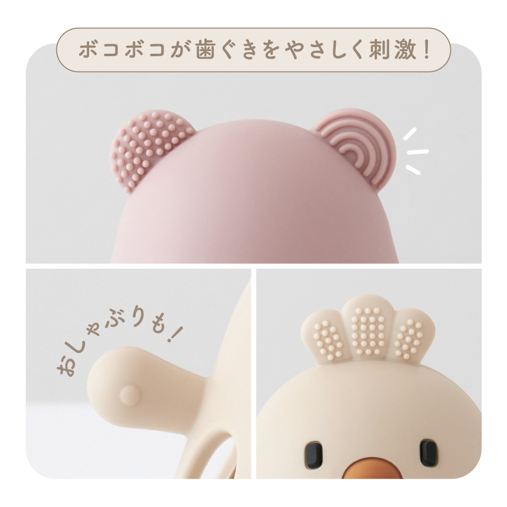 ベビーが思わず触りたくなるアニマルデザインがかわいい歯固め。やわらかなシリコン製で触り心地もよく、「かむ」以外にも「なげる」「つかむ」「ひっぱる」といった、いろいろな遊びが楽しめるので、知覚のトレーニングにも使えます。