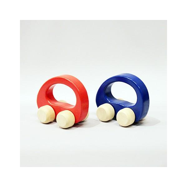 握りやすく程よい重さのある赤と青の木製の車2台セット。