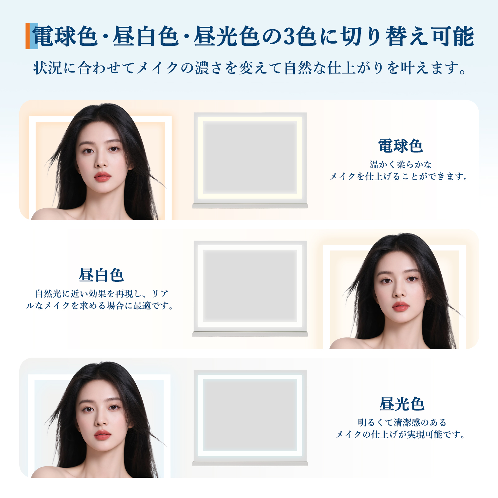 電球色/昼白色/昼光色の3色に変更が可能で、状況に合わせてメイクの濃さを変えて自然な仕上がりを叶えます。天気や部屋の照明の影響を受けずに、暗い場所や夜でも綺麗にメイクできます。