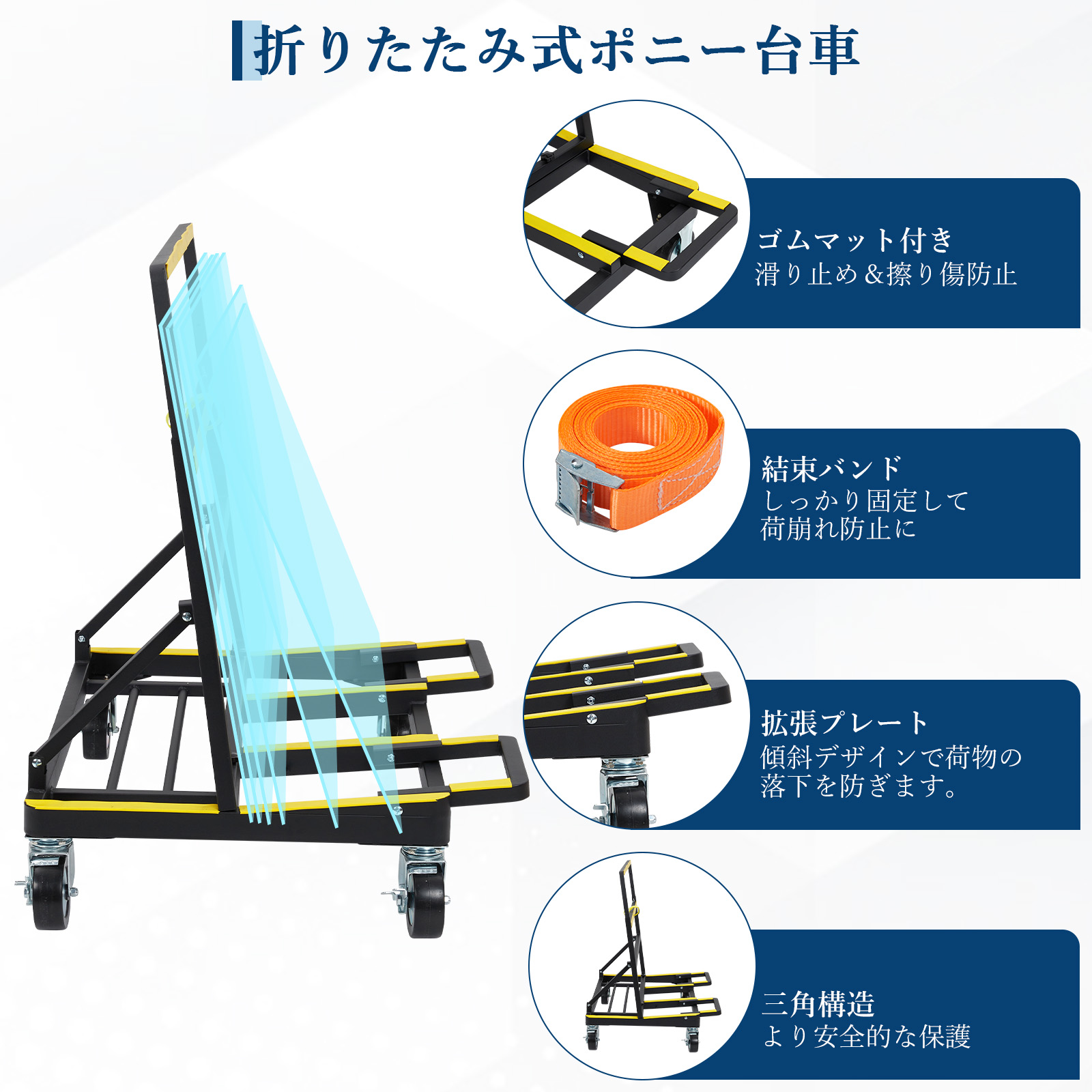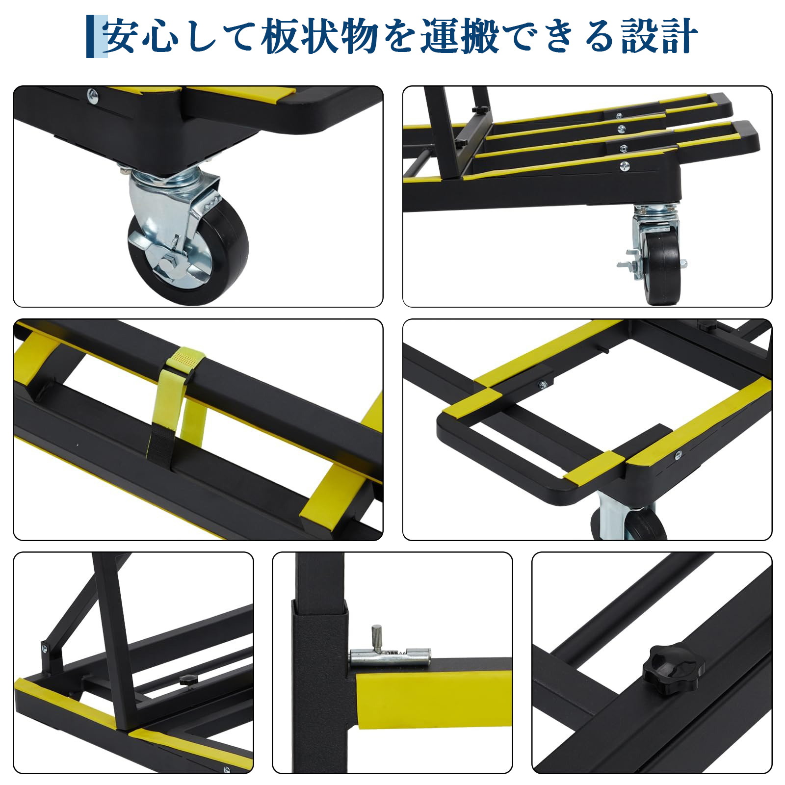 ボード台車 長尺物台車 折りたたみ 耐荷重最大1000kg ポニー台車 運搬台車 作業台車 拡張プレート 伸縮ハンドル キャスター付き 安全ベルト付き 大型