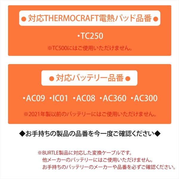 この変換ケーブルを使うと2025年製、2024年製、2023年製、2022年製のバッテリーで、【TC250】電熱パッドが使用できるようになります。