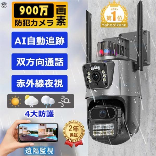 防犯カメラ 屋外 家庭用 900万画素 超高画質 夜間カラー録画 自動追跡 パンチルト デュアル 見守りカメラ 遠隔監視 スマホ対応 IP66防水防塵 工事不要 駐車場