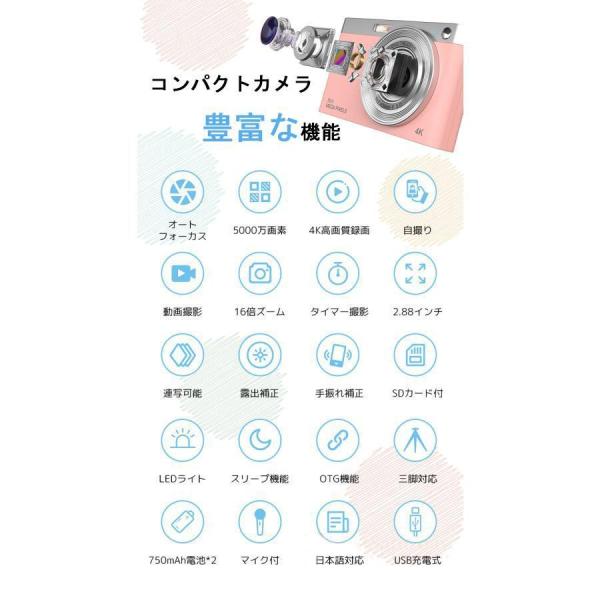 デジタルカメラ 日本製 4K 5000万画素 キッズカメラ 安い 軽量 2.88インチ 初心者 子供 16倍ズーム ポケット デジカメ 自撮り 動画 撮影 AF プレゼント 卒業祝い