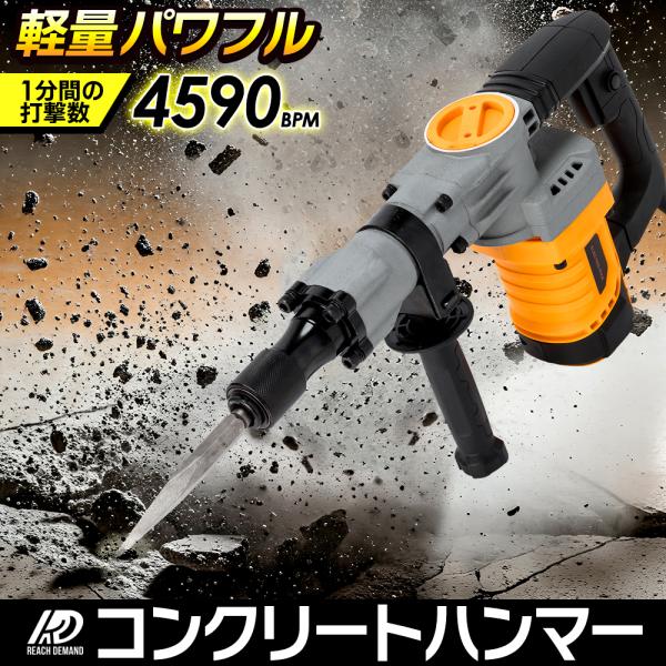 コンクリートハンマー 2400W 電動 強力4590bpm 360度回転ハンドル 斫り・破砕・穴あけ対応 チゼル3種付属(平・尖・広幅) 重量5.6kg 軽量 解体工事 DIY
