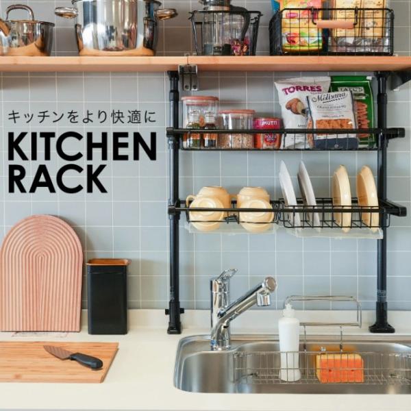 新年応援価格300円OFF 伸縮キッチンラック 突っ張りラック 水切りラック スリム おしゃれ 伸縮 ラック 2段式 水切り お皿 コップ 調味料 キッチン 固定具つき