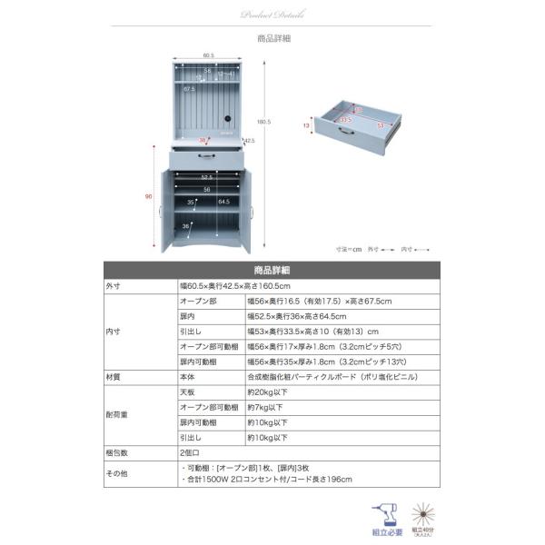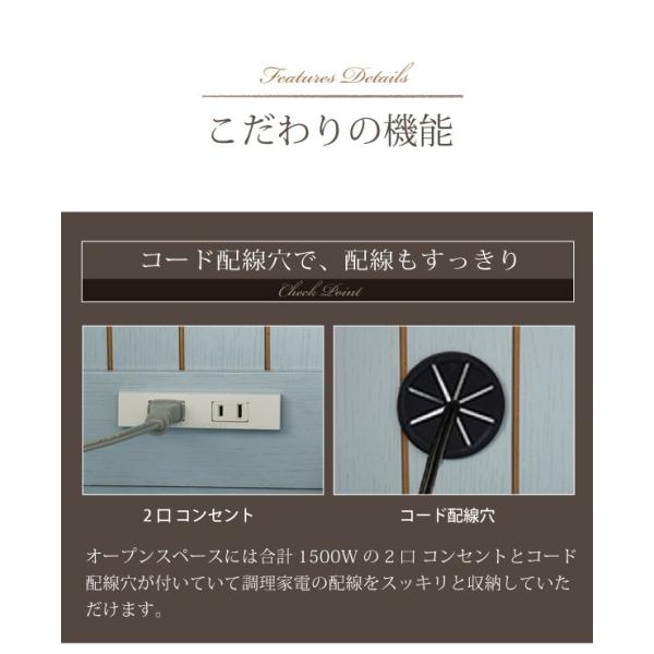 バイカラーで魅せるフレンチカントリースタイルのカップボード。コンパクトサイズなので一人暮らしにも最適。オープン部は2口コンセント付だから、トースターなどの調理家電の収納に便利。上段には、可動棚があるので、調味料などの小物収納に最適。下段は、引き出しと扉収納で、カトラリーから食器類をしっかり収納出来ます。丸みを帯びたフォルムと、アンティーク調の取っ手といったディテールがカントリーテイストを漂わせます。
