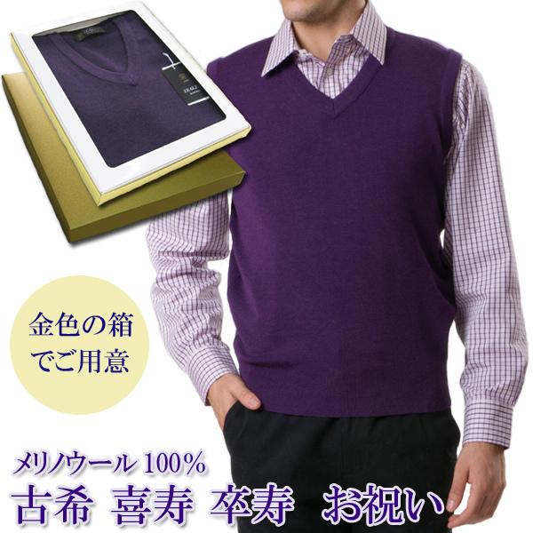古希 喜寿 卒寿 祝い メリノウール 100% Vベスト 古希 (70歳) 喜寿 (77歳) 卒寿(90歳) の 御祝 紫 V首 ニット ベスト S M L LL お祝い 熨斗