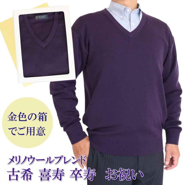 古希 喜寿 卒寿 祝い メリノウールブレンド ゴム地 Vネック セーター アクリル ウール 古希 (70歳) 喜寿 (77歳) 卒寿 (90歳) 御祝 紫 S M L LL お祝い 熨斗 652
