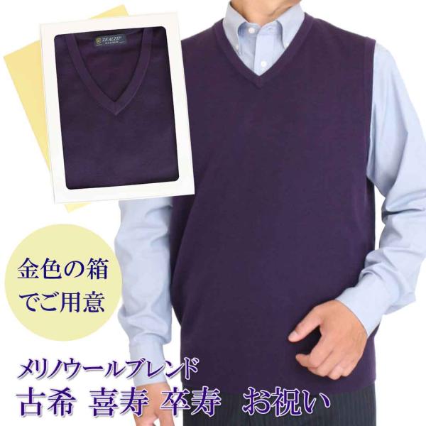 古希 喜寿 卒寿 祝い メリノウールブレンド ゴム地 Vベスト アクリル ウール 古希 (70歳) 喜寿 (77歳) 卒寿 (90歳) の 御祝 紫 S M L LL お祝い 熨斗 650