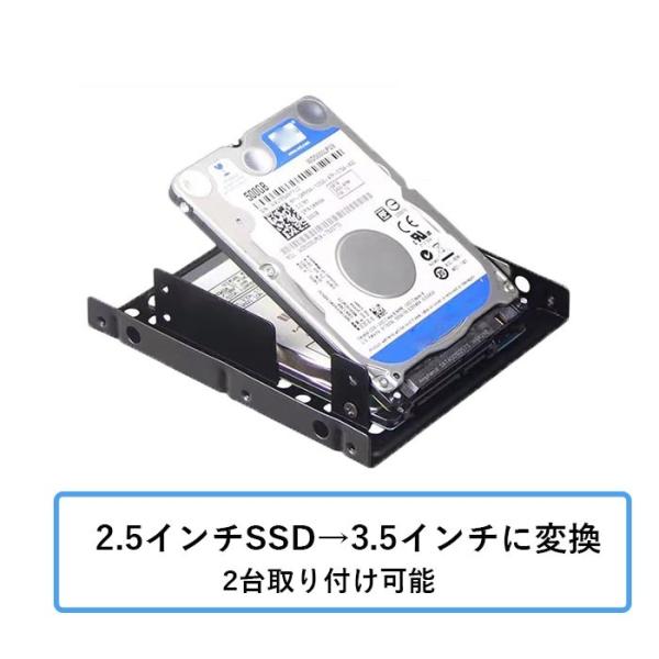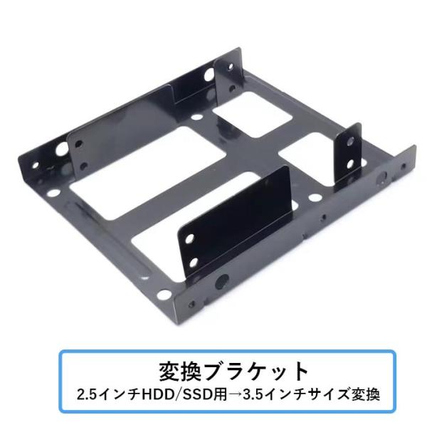 商品名:変換ブラケット(2.5インチHDD/SSD用→3.5インチサイズ 2台取り付け可能)サイズ:12x10x2.5cm色:ブラックパッケージ :変換ブラケット* 1、8本のネジ(固定式ハード・ドライブ4個、固定ブラケット4個)