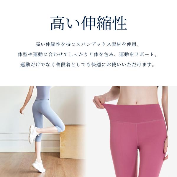 高い伸縮性を持つスパンデックス素材を使用。体型や運動に合わせてしっかりと体を包み、運動をサポート。運動だけでなく普段着としても快適にお使いいただけます。