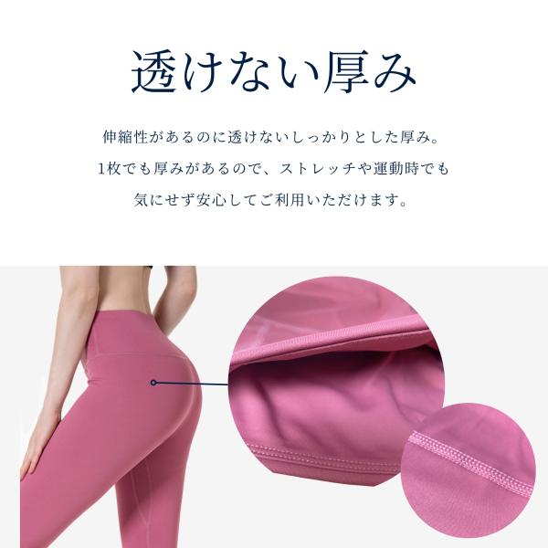 伸縮性があるのに透けないしっかりとした厚み。1枚でも厚みがあるので、ストレッチや運動時でも気にせず安心してご利用いただけます。