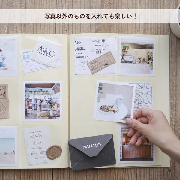 アルバムのポケット台紙にましかく(正方形/スクエア)にプリントされた写真やデコレーションカードを入れて簡単にレイアウトを楽しめます。