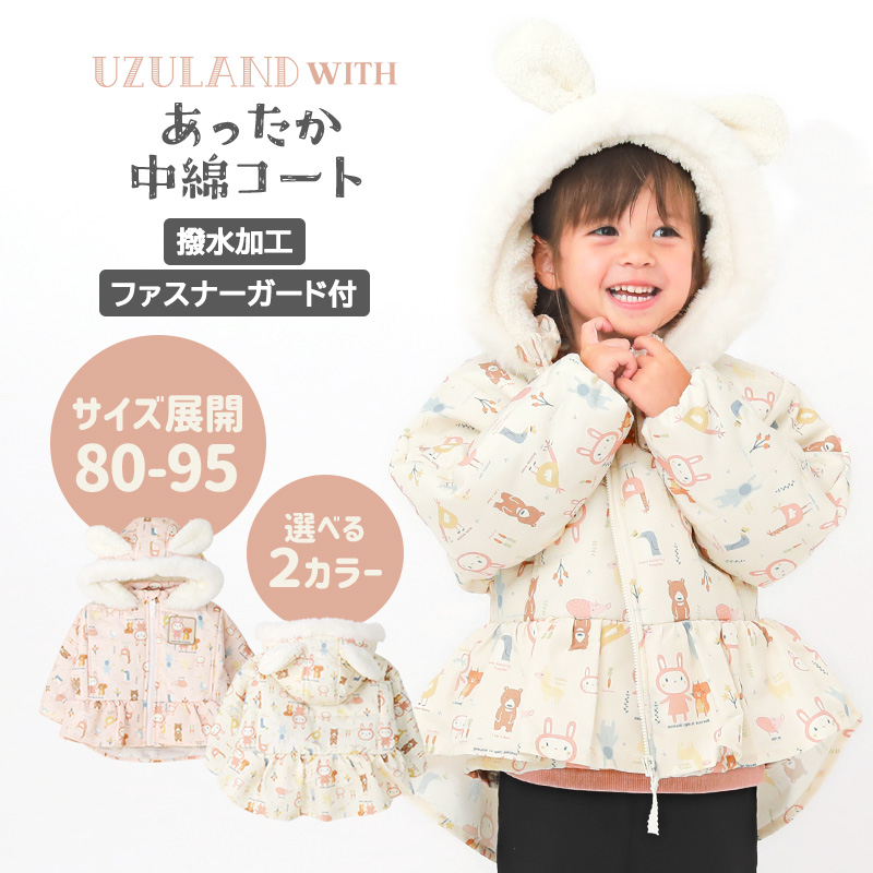 コート ベビー 中綿 ジャケット 女の子 うさぎ 耳 80cm 90cm 95cm あったか 防寒 撥水加工 子供服 アウター UZULAND ウズラビット キッズ かわいい ピンク