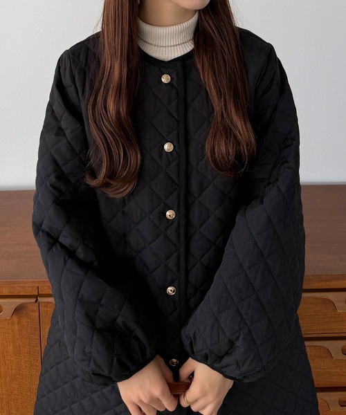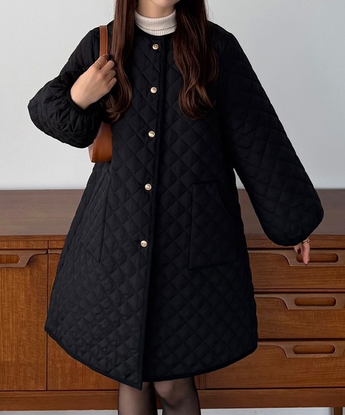 ノーカラーコート コート 金ボタンノーカラーキルティングコート レディース