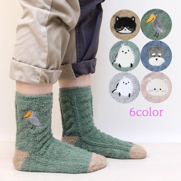 靴下 暖かい 厚手 ルームソックス かわいい シマエナガ 猫 犬 ハシビロコウ 白猫 鳥 滑り止め ふわふわ もこもこ 冬 22-25cm アップリケ ぽかぽかルームソックス