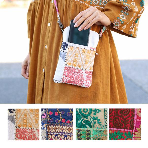 スマホポーチ レディース 縦型 布製 パッチワーク ポケット ビーズ ヴィンテージ ショルダー ファスナー カンバディアパッチ スマホポシェット